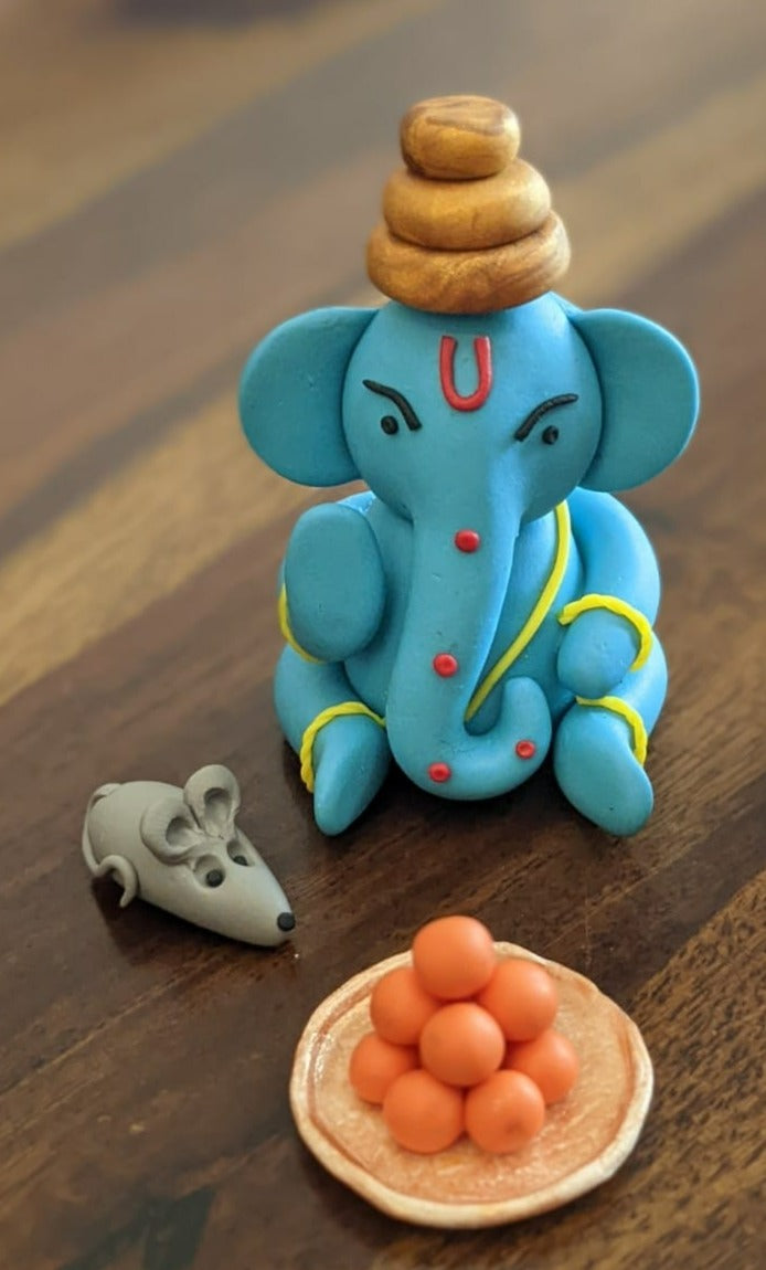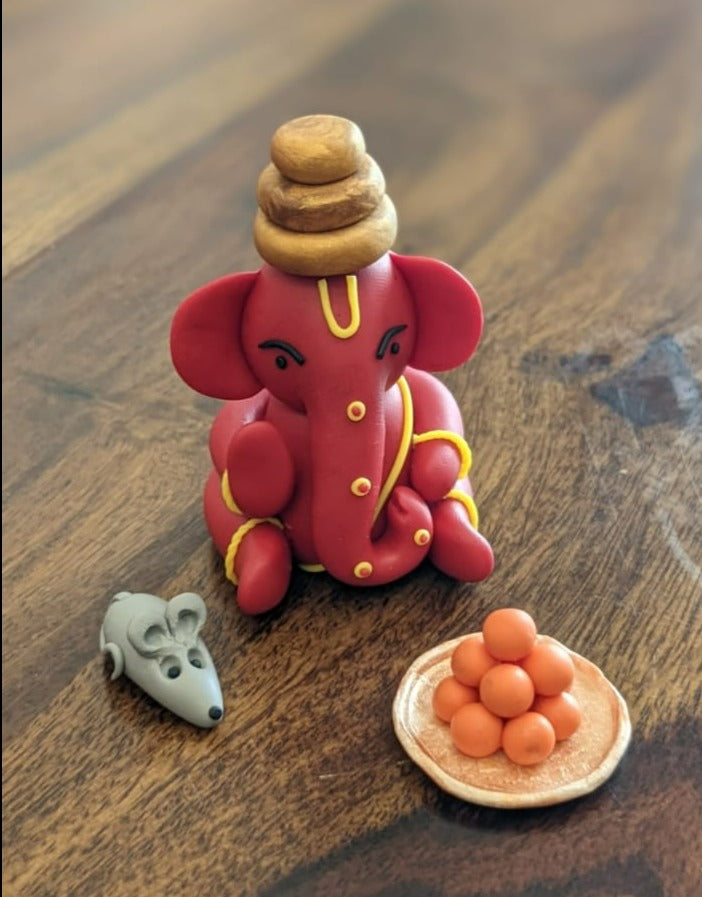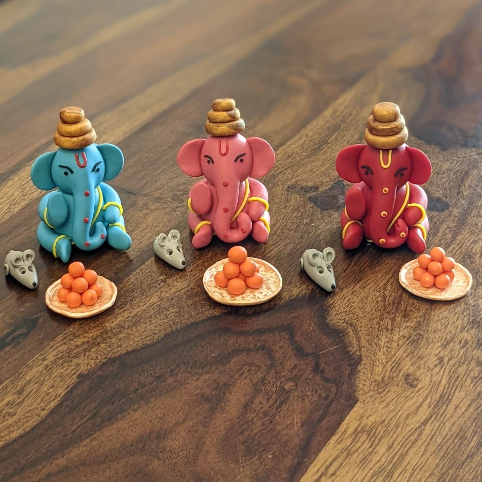 A unique handcrafted miniature Ganesha with a plate of ladoos and a miniature mouse for your home décor. Suitable for use as car dashboard decor, terrariums or miniature gardens. These are made with polymer clay and are baked. Available in 3 color options.