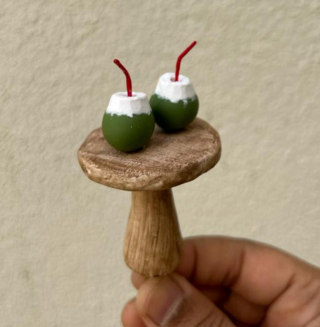 The miniature tender coconut and the table are created in polymer clay on a natural stone. The polymer clay used in this miniature is baked and water resistant. Can be used in miniature garden and terrariums