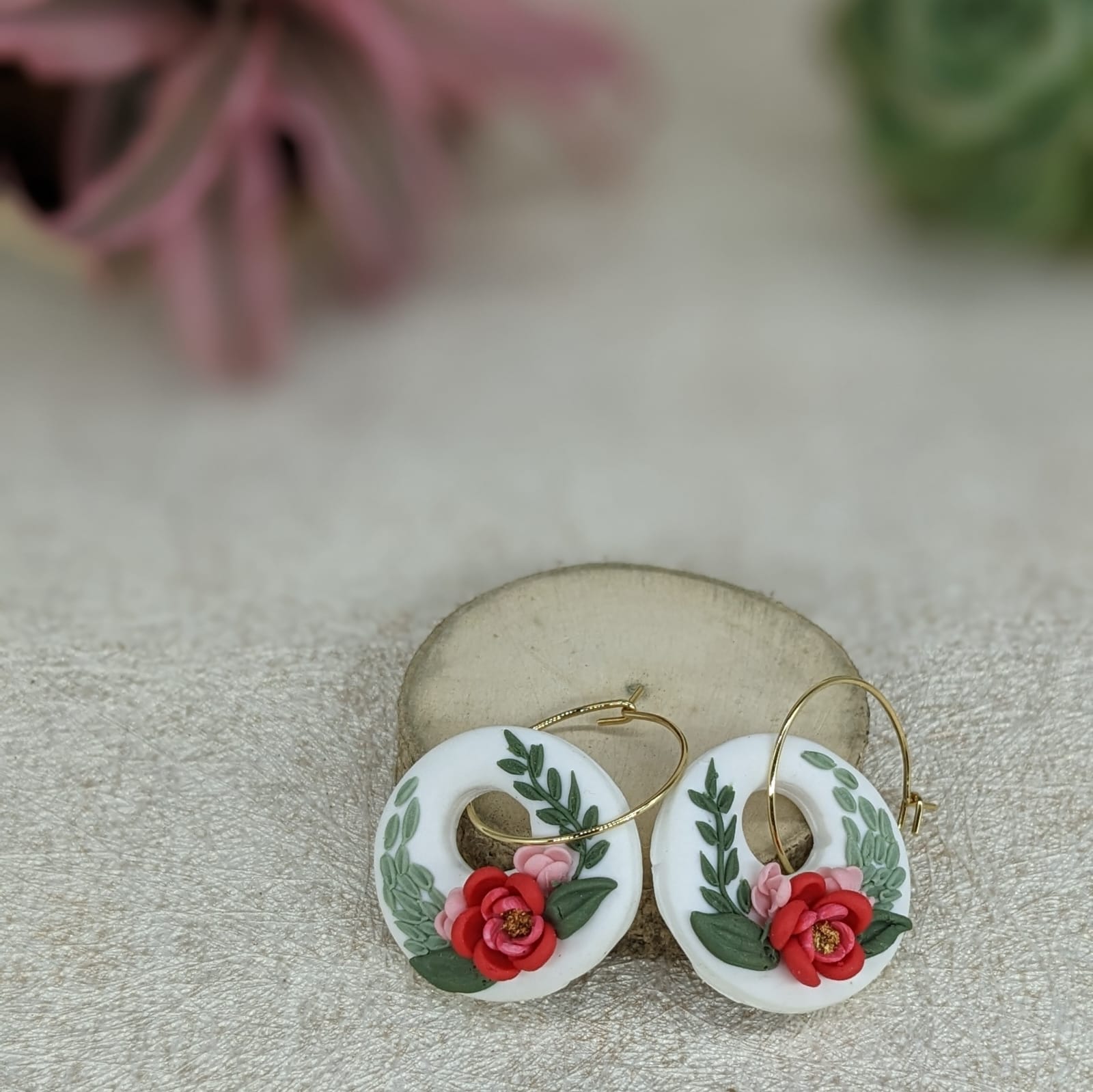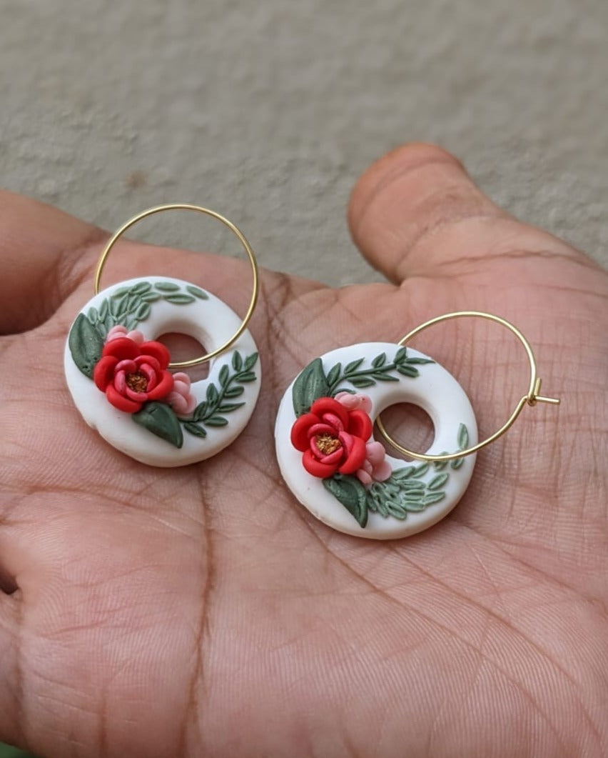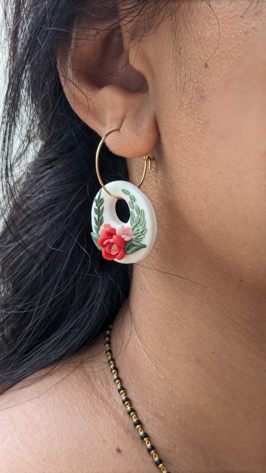 A unique pair of ear ring hoops handcrafted in polymer clay attached with gold plated hoops. Goes well with traditional as well as casual attire