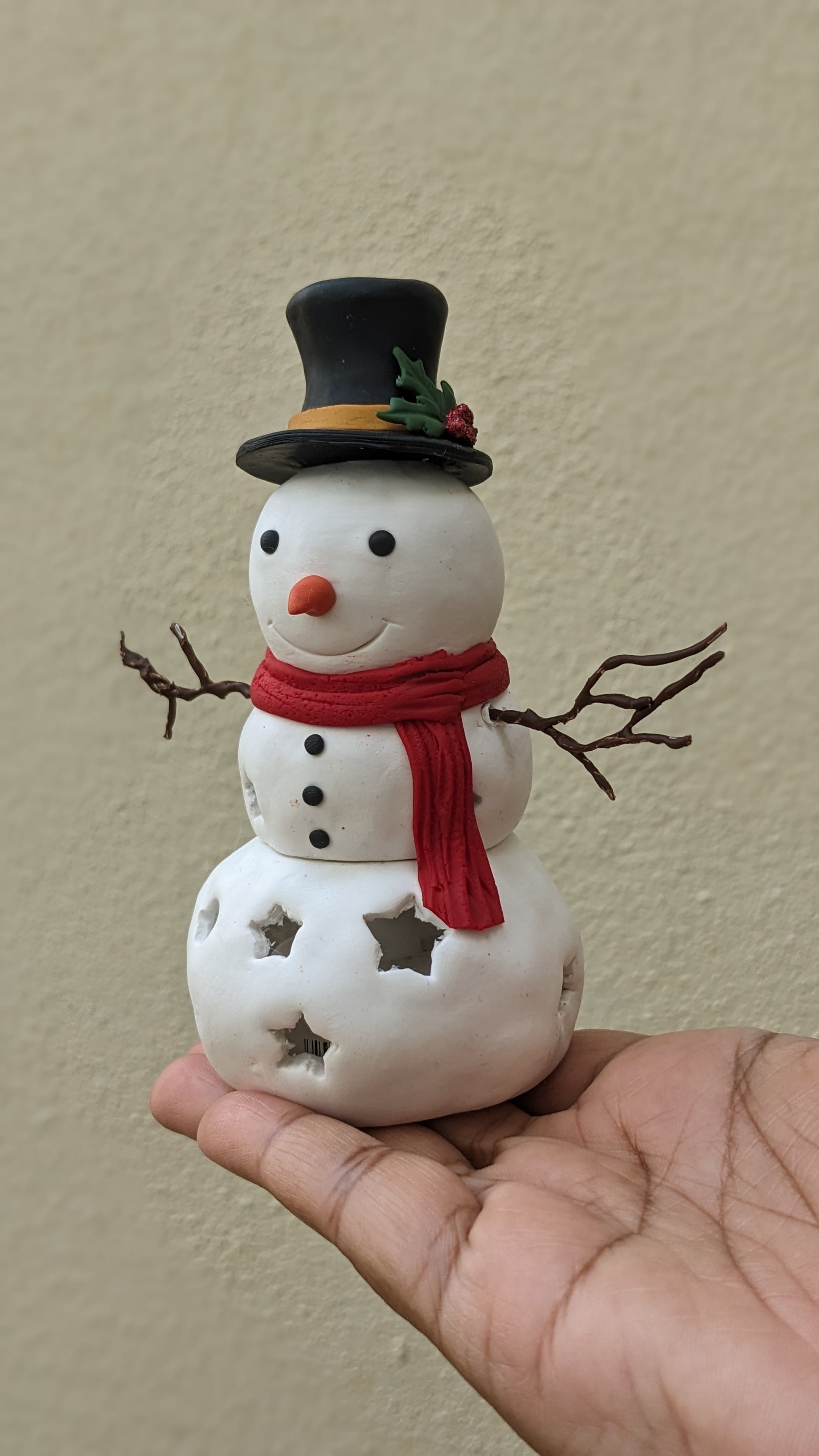 Every detail — from the twinkle in his eyes to the hand-sculpted buttons and scarf — is made lovingly by hand using premium-quality clay. When lit, the soft golden light shines through the star-shaped cutouts, creating a cozy glow that instantly brings festive warmth to any corner of your home.